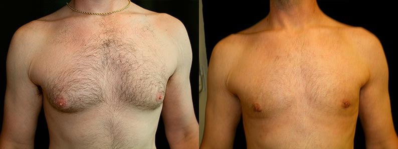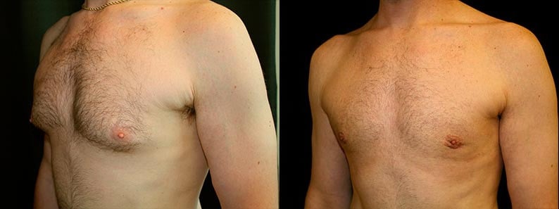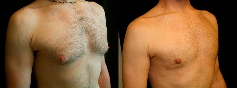 This is a 39-year-old male from Applegate, California, who presents with adolescent gynecomastia and for male breast reduction surgery. He had 41 grams of breast tissue removed from his right chest and 39 grams of tissue removed from his left chest. In addition, he had approximately 500 cc of fat and aspirate liposuction from each side. His photographs are seen at about three months after surgery. His overall goal was to “get rid of the fatty tissue” that he can’t reduce by exercise.