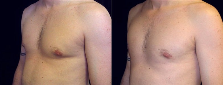 This is a 28-year-old resident of Downey, California who presented to the San Francisco office at Union Square for evaluation for gynecomastia. He is 6 feet tall and weighs 200 pounds. He lost approximately 100 pounds over the past year. He has had the condition since 18 years old and, therefore, this is adolescent gynecomastia. His goal is to feel more normal in his clothing. He underwent gland excision and suction-assisted lipectomy at Marin Cosmetic Surgery Center in Marin County, California. He had 20 grams removed from his right side and 38 grams removed from his left. In addition, he had 250 cc of fat liposuctioned from his right and 150 from his left. The postop photos are seen approximately six months after surgery.