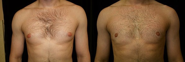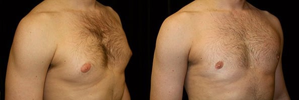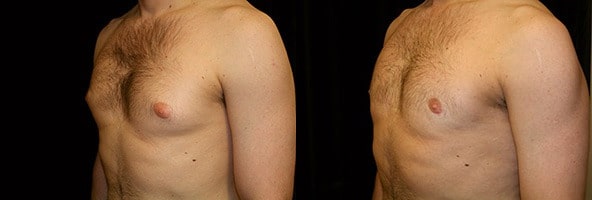 Burlingame, California – This is a 35 year old male who presents with steroid induced gynecomastia and presents for gland excision and liposuction. He does not take off his shirt due to the fullness in his chest. He does have some intermittent pain and would like to have a flat chest. He underwent gland excision at Marin Cosmetic Surgery Center in Novato, California. He had 22 grams of breast tissue removed from his right chest and 31 grams of breast tissue removed from his left chest. He also had extraction of 550 cc. of fat and aspirate from his right chest and 650 cc. of fat and aspirate from his left chest. He had an uneventful post operative course. His photographs are seen at four weeks after surgery. Of note, he was interested in having the gland removed completely and therefore we did total gland excision and fat flap closure to alleviate a crater deformity.