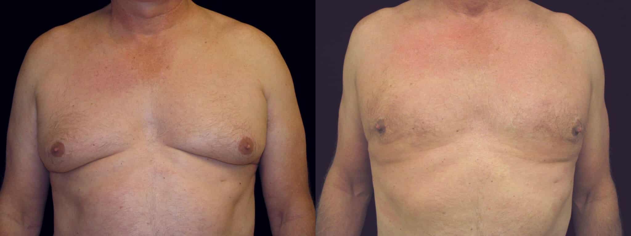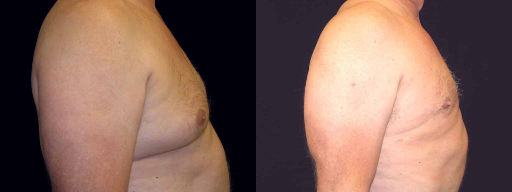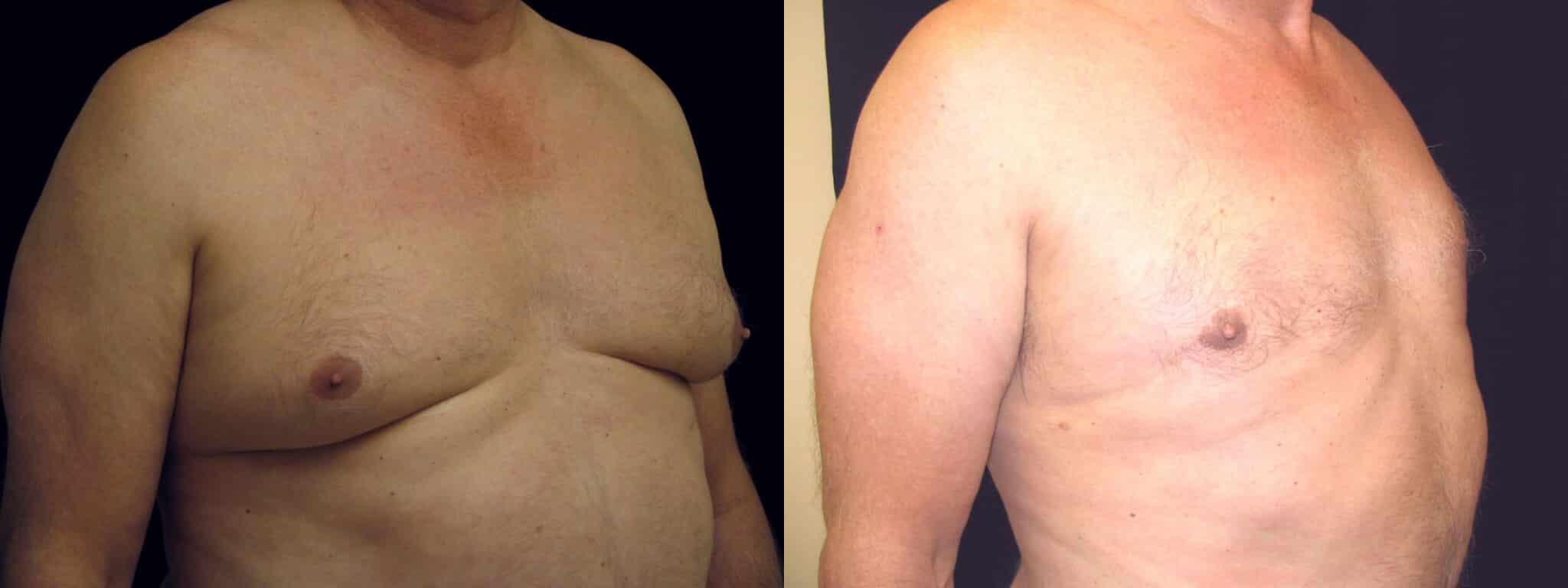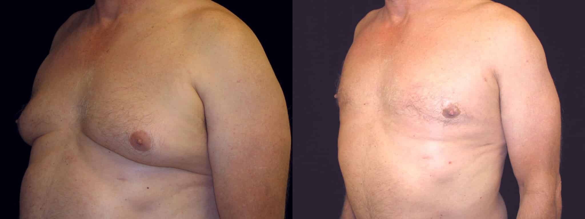 Note this is a grade 3 of 4 gynecomastia with significant skin excess. This patient is a good candidate for a skin excision mastectomy procedure.  He did not want the scars and willing to live with the skin issues.  Fortunately, he turned out surprisingly well with the skin tightening techniques.