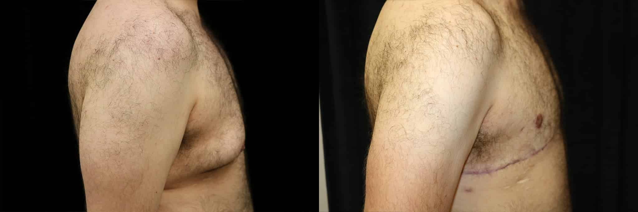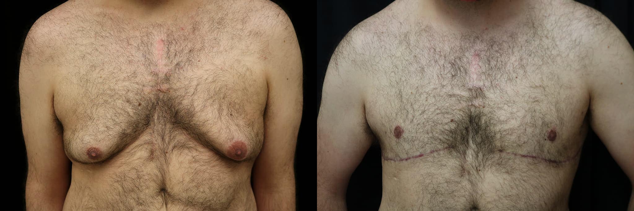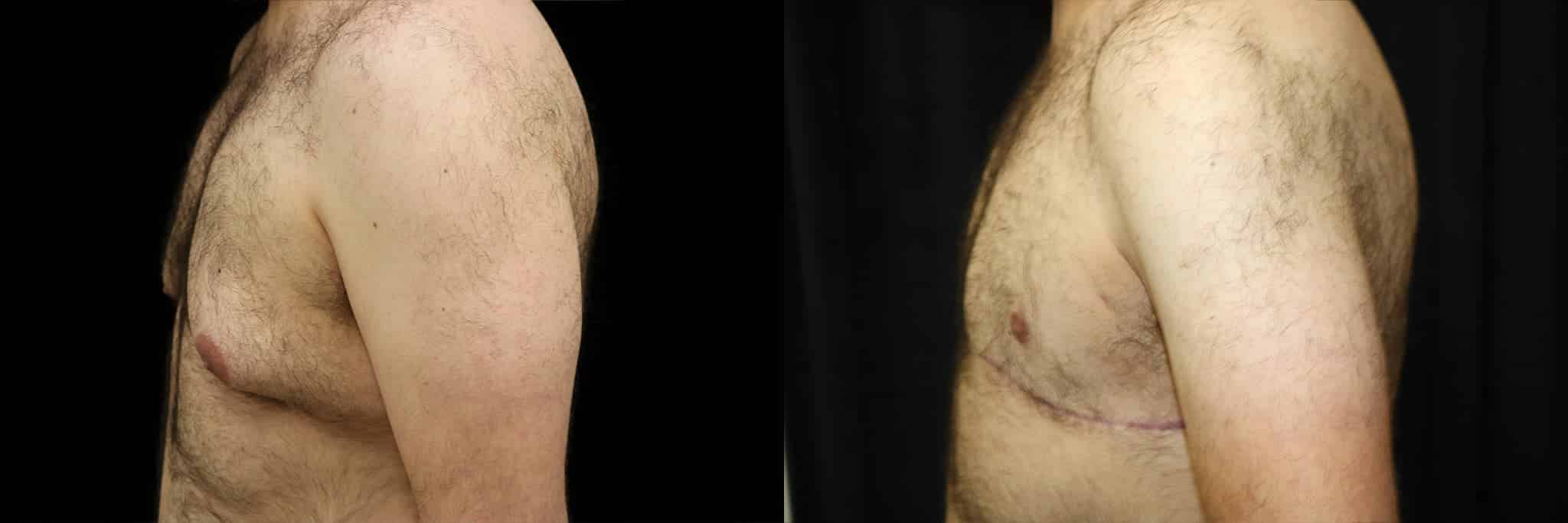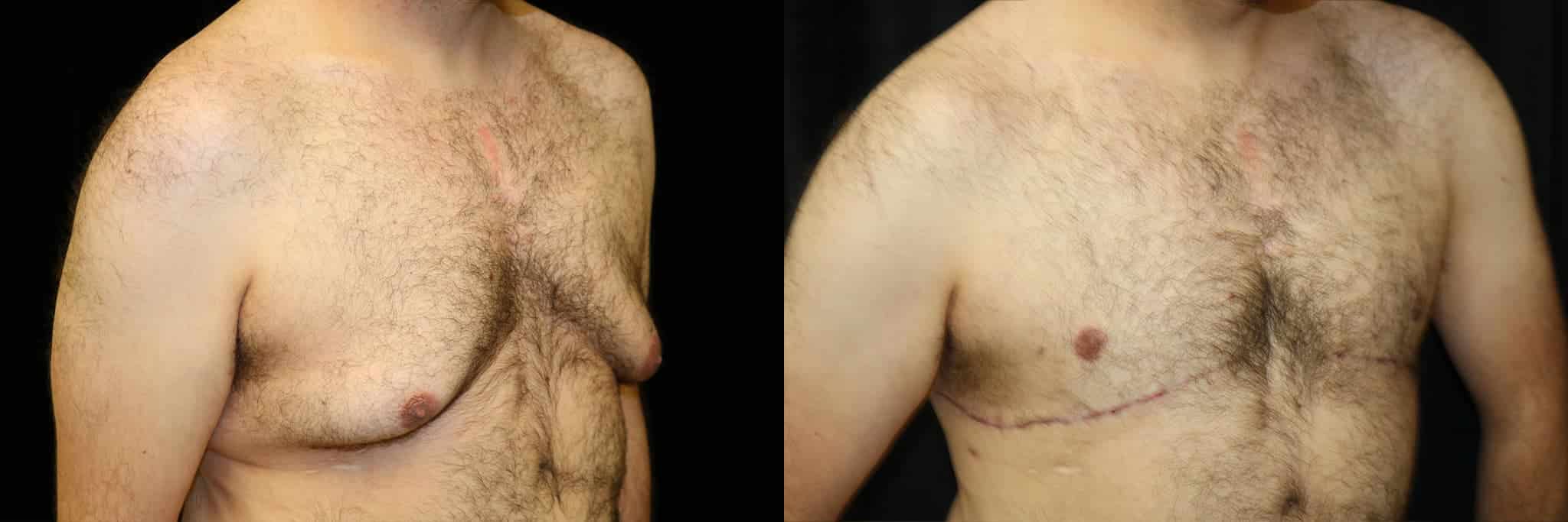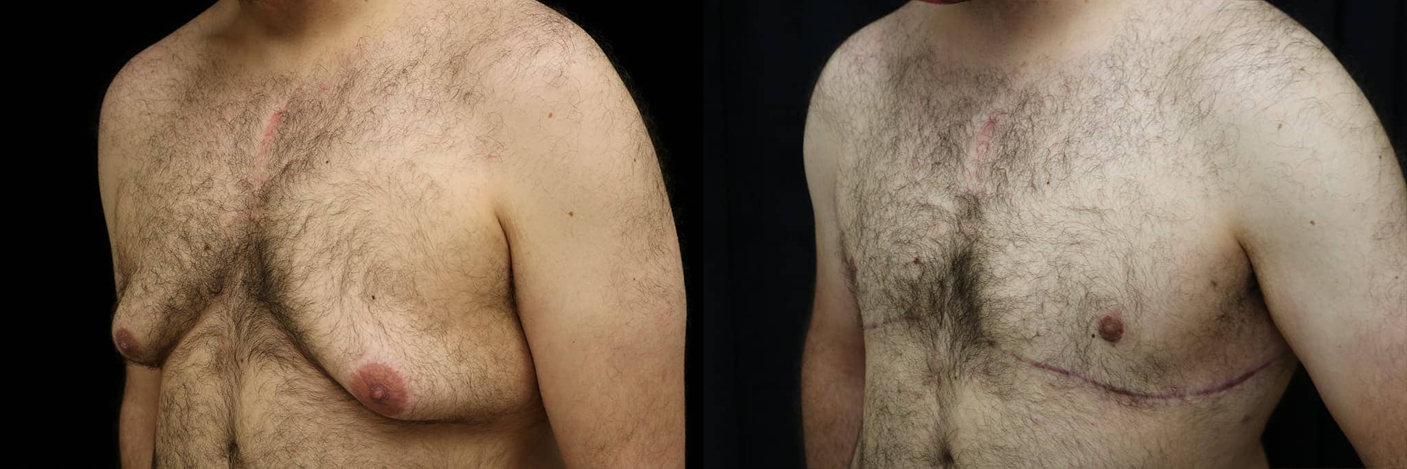 This patient is a 45-year-old male who has had massive weight loss and presents with a grade 4 gynecomastia. He undergoes a free nipple double incision mastectomy (skin excision and nipple repositioning). Photos are taken approximately three months after surgery. The incisions are slowly beginning to mature.