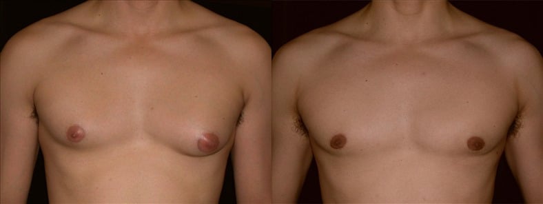This 28-year-old man is 5’10” and 175lbs. He sought my help to correct his steroid-induced gynecomastia. As you can see, the left glandular component was much larger than the right. He underwent glandular excision and suction-assisted lipectomy of the chest.