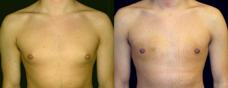 This is a 19-year-old resident of St. Louis, Missouri who presented to the San Francisco office at Union Square for evaluation for gynecomastia. He is 6 feet tall and weighs 185 pounds. His complaint is the puffy nipples, which causes him severe embarrassment. He underwent gland excision and suction-assisted lipectomy at Marin Cosmetic Surgery Center in Marin County, California. He underwent excision of 5 centimeters of tissue from his right side and 5 centimeters from his left. In addition, he had 125 cc of fat extracted from his right side and 150 from his left. The photographs are taken eight days after surgery since he is from St. Louis.