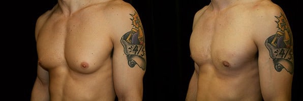 Dublin, California – This is a 28 year old man who presents with steroid induced gynecomastia and presents for gland excision and liposuction. He had one or two cycles of Anabolic Extreme which caused development of breast glandular tissue. His goal is to get his chest back to normal. He underwent gland excision and liposuction at Marin Cosmetic Surgery in Novato, California. He had 29 grams of breast tissue removed from his right chest and 72 grams removed from his left chest. He also had approximately 75 to 100 cc. of fat and aspirate removed from each side of his chest. His post operative course was complicated by a small seroma and 3 cc. was tapped from his right chest and healed spontaneously. His photographs were taken three months after surgery.