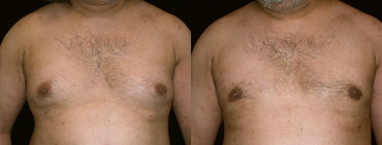 This 33-year-old man is 5’11” and 214lbs. He developed gynecomastia during adolescence and would never remove his shirt in public. Prior to seeking my assistance, he had gynecomastia surgery with another physician, but was dissatisfied with the results. I performed a secondary procedure for him, consisting of glandular excision and suction-assisted lipectomy of the axillae. I removed 600cc of fat from each axilla and 250cc from each side of his chest. I also extracted substantial glandular tissue, 49 g