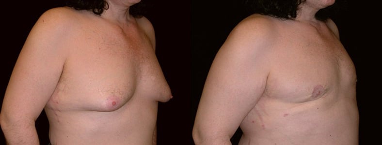 This 46-year-old man developed gynecomastia during adolescence. He underwent ultrasonic liposuction of the chest and axillae, from which I extracted a total of 650cc of fat from the right side of his chest and 700cc from the left. I also excised a total of 115 grams from the right and 135 grams from the left.