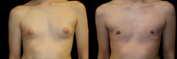 Moraga, California – This is a 16 year old male who presents with adolescent gynecomastia and presents to the San Francisco office for gland excision and liposuction. He has had an enlarged chest for approximately three years and never takes off his shirt. He wears sweat shirts all day to cover up his chest. His father has the same condition as well. His goal is to be more comfortable with his chest and to be able to take off his shirt in public. He underwent gland excision and liposuction of his chest. He had 74 grams of breast tissue removed from his right chest and 78 grams of breast tissue removed from his left chest. In addition he had 100 cc. of fat liposuctioned from his right chest and 200 cc. of fat removed from his left side. He had a normal post operative course. His photographs are seen approximately two months after surgery.