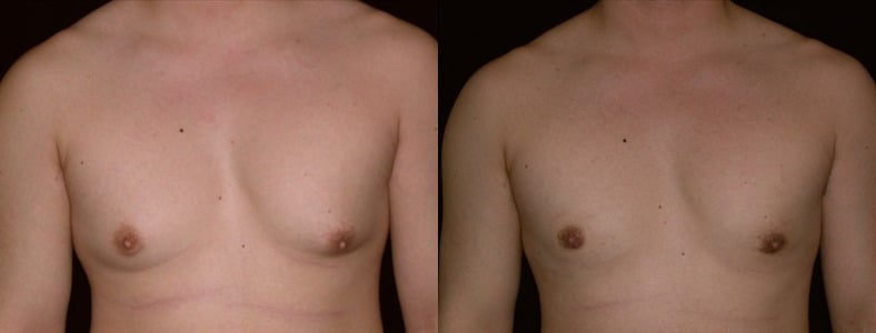 This 24-year-old man is 5′ and 200lbs. He suffers from adolescent gynecomastia, and prior to surgery never exposed his chest. He underwent glandular excision and suction-assisted lipectomy, from which I removed a total of 325cc of fat from the right side of his chest and 250cc from the left side. His goal was to be able to go “shirtless this summer.