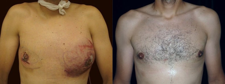 This is a 38-year-old resident of Oakland, California who presented to the San Francisco office at Union Square for evaluation for gynecomastia. He is 5 feet 11 inches tall and weighs 214 pounds. He has had previous gynecomastia surgery in year 2000 with liposuction only. He is not happy with the outcome and, therefore, presented to my office for further evaluation. His goal is to be able to wear a T-shirt and feel comfortable. He underwent gland excision and suction-assisted lipectomy at Marin Cosmetic Surgery Center in Marin County, California. He had 49 grams removed from his right side and 44 grams removed from his left. In addition, he had 600 cc of fat liposuctioned from his right side and 500 cc from his left. These photographs are seen six months after surgery. Note this is a common reason for revisional surgery, in which patients have liposuction only as their treatment. Thirty to thirty-five percent of my practice is redo surgery from other physician practices and the primary reason is due to liposuction only. This does not remove the glandular tissue.