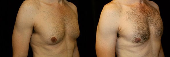 This treatment involves two stages or separate surgeries. The first procedure is a standard male breast reduction surgery performed as an outpatient procedure under general anesthesia. Glandular tissue will be removed through a small, half-moon-shaped incision at the edge of the nipple-areolar complex. Excess fatty tissue and skin will be removed to elevate the nipple-areolar complex which may have sunken or started to point downward. This will create a flatter chest appearance, but there may still be excess skin that requires a second male breast reduction procedure.