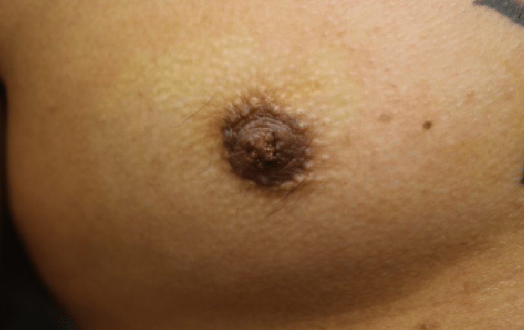 • The entire pigmented area of the skin protrudes and appears to have a “puffy” areolas in the appearance.